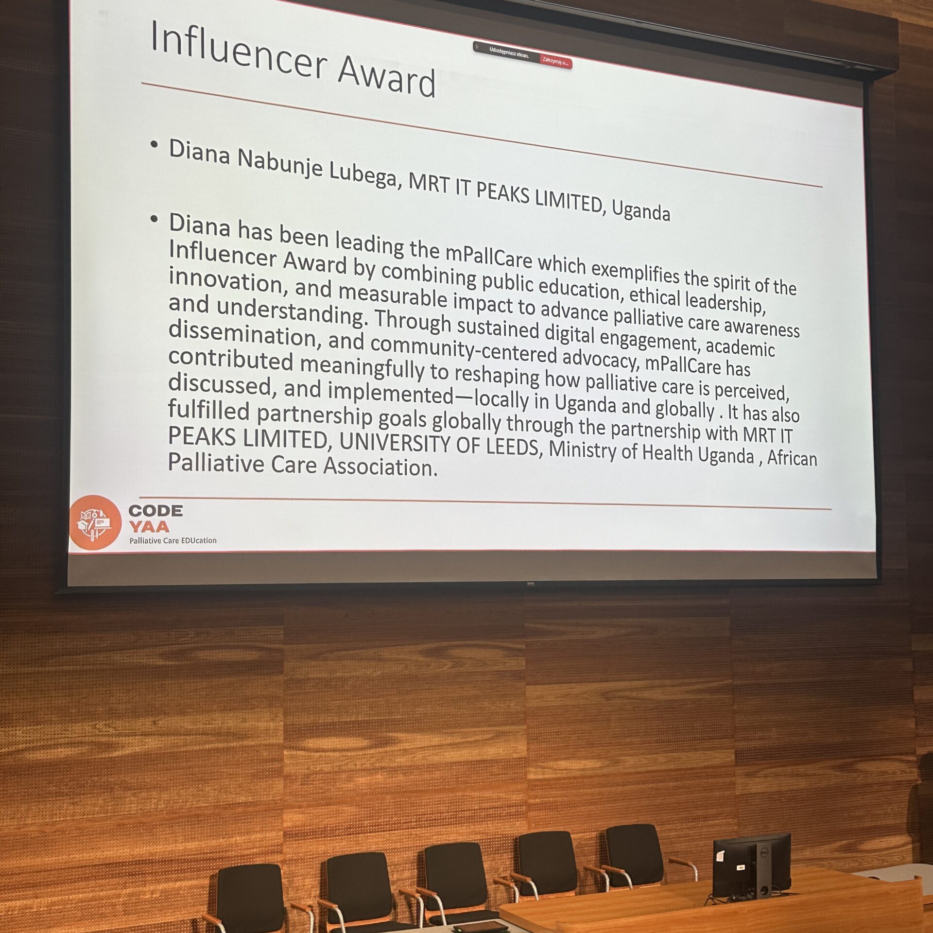 The individual award was presented to Diana Nabunje Lubega (Uganda) for her leadership of the mPallCareinitiative. Through sustained digital engagement, academic dissemination, and community-centred advocacy, mPallCare has made a significant contribution to reshaping how palliative care is perceived, discussed, and understood—both locally and globally. Her work exemplifies how ethical, innovative, and inclusive communication can generate tangible educational and societal impact.